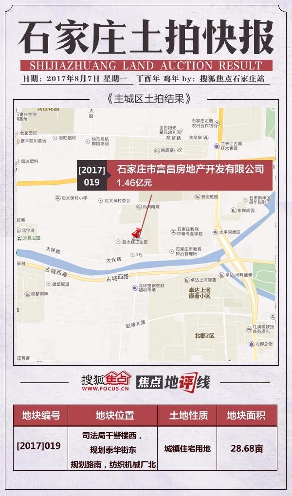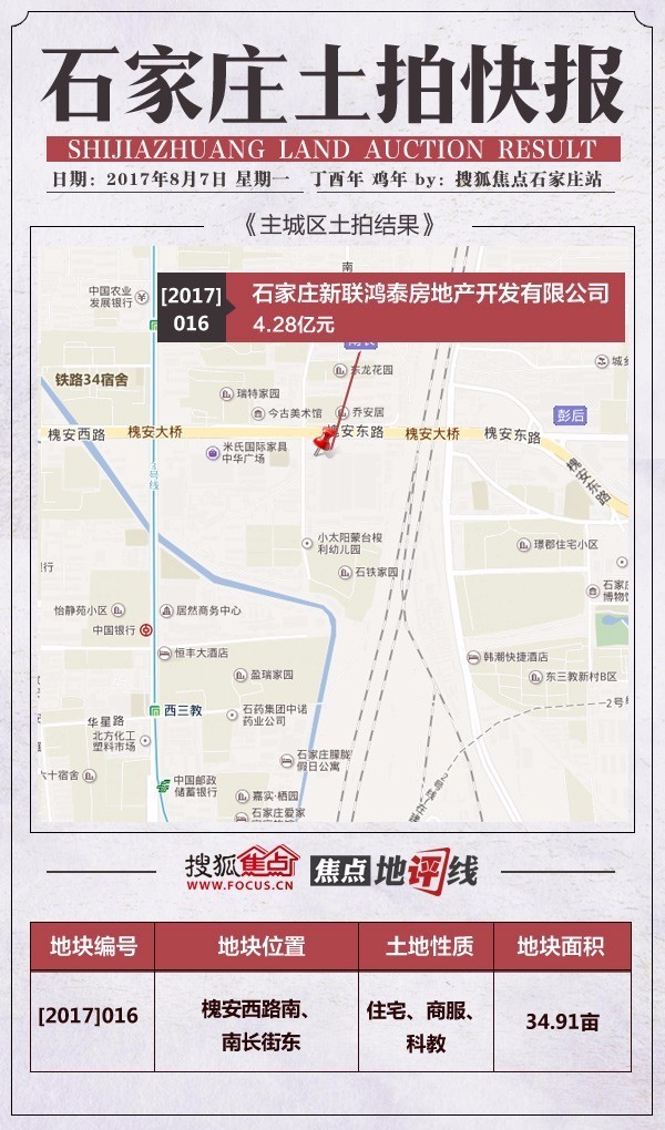 [2017]016号地位于槐安西南、南长街东,正在建项目为安联国际核心二印项目,为润泰纺织印染无限公司旧址,2010年8月已全体搬家至无极北苏工业园区。仓兴街以东,塔北以南,扶植大街以西,占地8036。8平方米,约合12。0552亩。该地块紧邻市第五病院,周边还有仓兴糊口小区等,配套设备齐备,栖身空气稠密,是二环内不成多得的优良净地。
